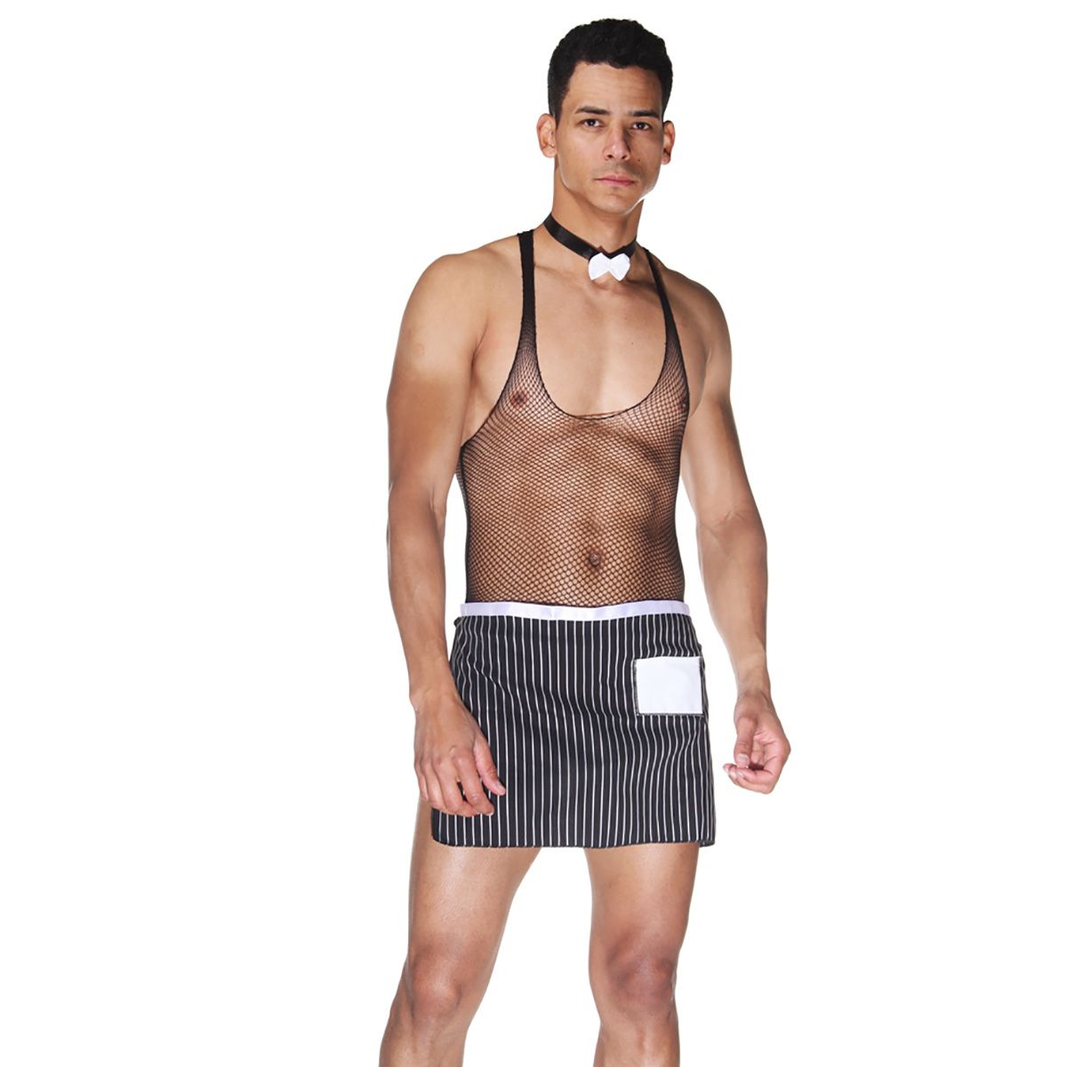 Игривый костюм официанта создан для тех, кому нравится разнообразие и эксперименты. Верх костюма сделан из мягкого эластичного материала в мелкую сеточку. Низ прикрывает только переднюю часть, оставляя ягодицы открытыми. В дополнение к образу в комплекте идёт белая бабочка. В комплекте: топ с фартуком, галстук-бабочка.