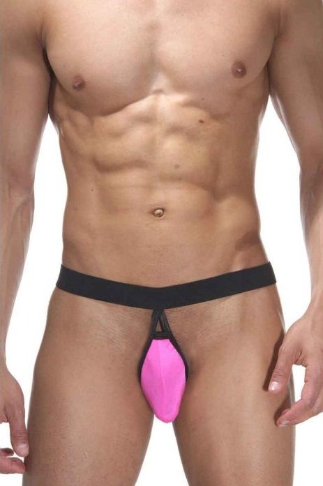 Мужские трусы-стринги на широкой черной резинке, с ярким розовым гладким гульфиком.