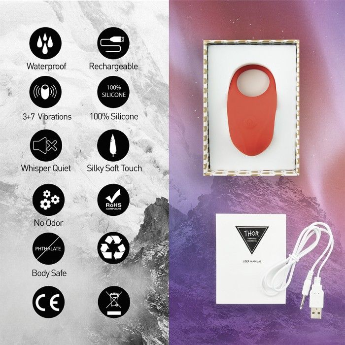 Водонепроницаемое вибрирующее кольцо для пениса красного цвета Thor от Feelztoys сделает мужскую эрекцию более продолжительной и сильной, за счет плотного обхвата полового член. Оно обладает сильными вибрациями и может использоваться как для одиночной игры, так и для пар. Для мужских соло-игр Вы можете носить эрекционное кольцо повернув его вибрирующим язычком вниз для стимуляции мошонки или во время парных игр - вверх, для стимуляции клитора женщины. Thor имеет 3 разные скорости и 7 разных паттернов вибрации, абсолютно не имеет запаха, с очень тихим мотором. Кольцо выполнено из шелковистого мягкого силикона и имеет идеальную форму, при полной зарядке оно проработает около двух часов.