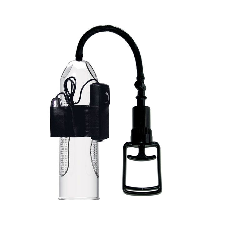 Вакуумная помпа с вибрацией, выполненная из прозрачного материала с уплотненной манжетой черного цвета, которая плотно обхватывает половой член, создавая полную герметичность. Воздух откачивается при помощи вакуумного шланга удобным механизмом откачки. Давление в колбе сбрасывается при помощи кнопки, расположенной на верхней части самой колбы. Механизм вибрации крепится к помпе с помощью эластичного материала с кармашком для виброяичка, которое управляется выносным пультом. Длина колбы - 24,5 см, диаметр - 7,3 см.
