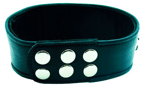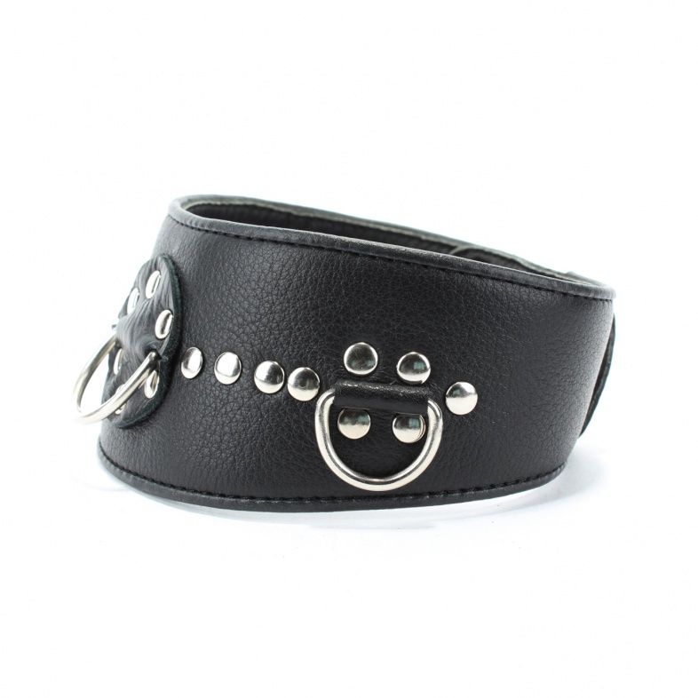 Чёрный кожаный ошейник с полукольцами и клёпками.